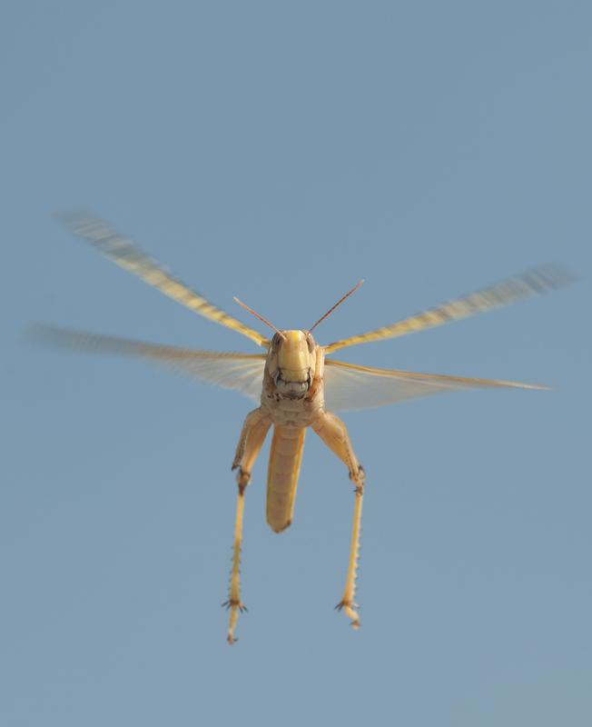 Die Sonne weist den Weg: Heuschrecke im Flug. Quelle: (Foto: Dr. Keram Pfeiffer / Philipps-Universität) (idw)