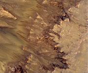 Im Mars-Frühling treten die dunklen Fliessspuren in Erscheinung – hier an einer Kraterwand im «Newton Basin». Bild: NASA/Uni Arizona/Uni Bern