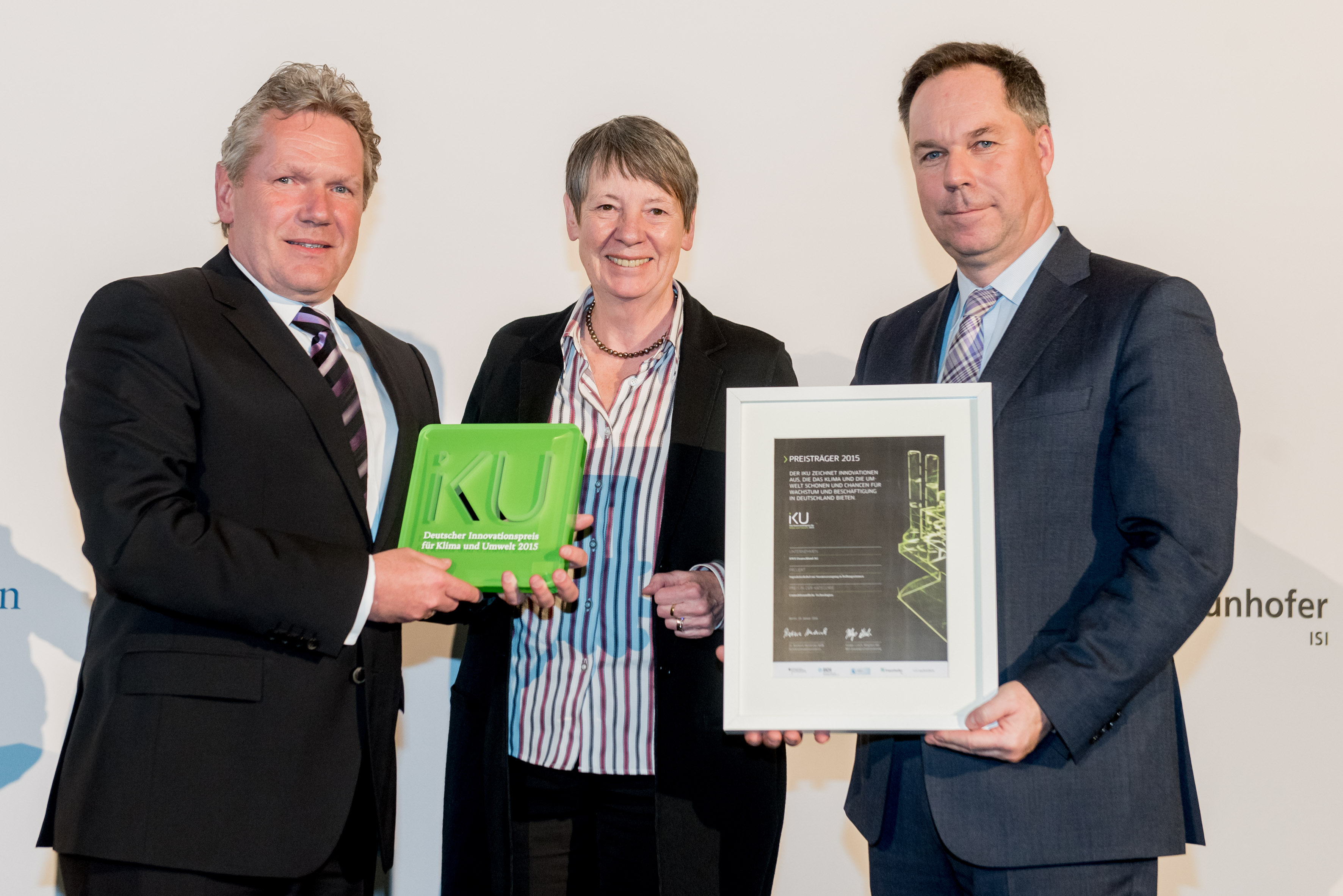 Auszeichnung für das Projekt AmpaCity: Dr. Joachim Schneider (l.), Technikvorstand der RWE Deutschland AG, nimmt in Berlin den IKU Innovationspreis für Klima und Umwelt 2015 von Dr. Barbara Hendricks, Bundesministerin für Umwelt, Naturschutz, Bau und Reaktorsicherheit, und Holger Lösch, Mitglied der Hauptgeschäftsführung des BDI, entgegen.Bild: "obs/RWE Deutschland AG/Christian Kruppa"