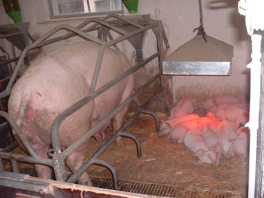 Sau in Kastenstand mit Ferkeln in der Intensivtierhaltung