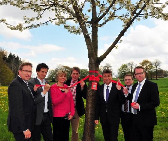 (v.l.): Samtgemeindebürgermeister Bersenbrück, Dr. Horst Baier, Terra Concordia-Geschäftsführer Kai Gildhorn, Baumpatin Maike Tiemann vom Weidehof Rieste, Geschäftsführer des Zweckverband Erholungsgebiet Hasetal, Wilhelm Koormann, DBU-Generalsekretär Dr.-Ing. E. h. Fritz Brickwedde, Verbandsvorsteher des Zweckverband Erholungsgebiet Hasetal, Werner Schräer, und Erster Kreisrat des Landkreises Osnabrück, Stefan Muhle. Bild: Zweckverband Erholungsgebiet