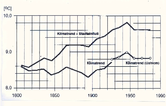 Temperaturverlauf von Berlin Innenstadt und Außenbezirken 1800 - 1990. Grafik: Prof. Dr. Horst Malberg