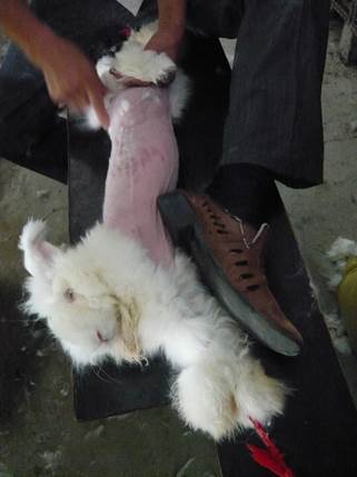 Schmerzhafter Lebendrupf bei Angorakaninchen in China. Bild: © PETA Asia Pacific