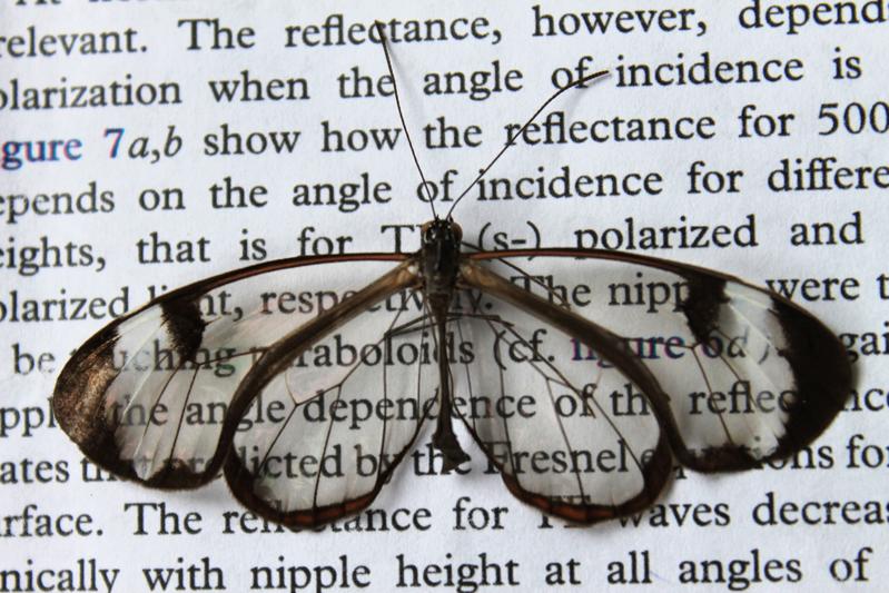 Im Gegensatz zu anderen durchsichtigen Flächen reflektieren die Flügel des Glas-flüglers („Waldgeist“, lat.: Greta Oto) kaum Licht. Brillengläser oder Handydisplays Quelle: Foto: Radwanul Hasan Siddique, KIT (idw)