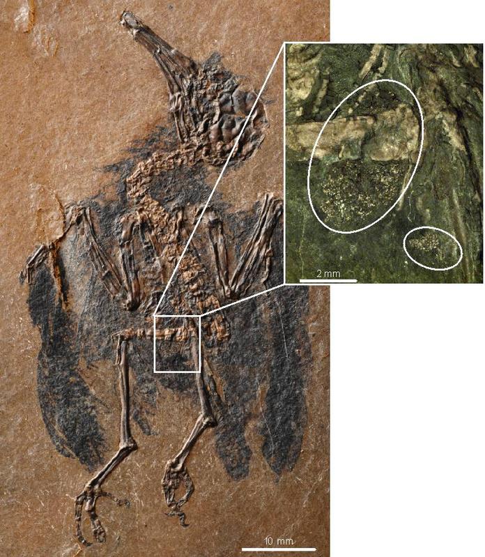 Der fossile Vogel mit seinem aufschlussreichen Mageninhalt (Ausschnitt) Quelle: Senckenberg (idw)