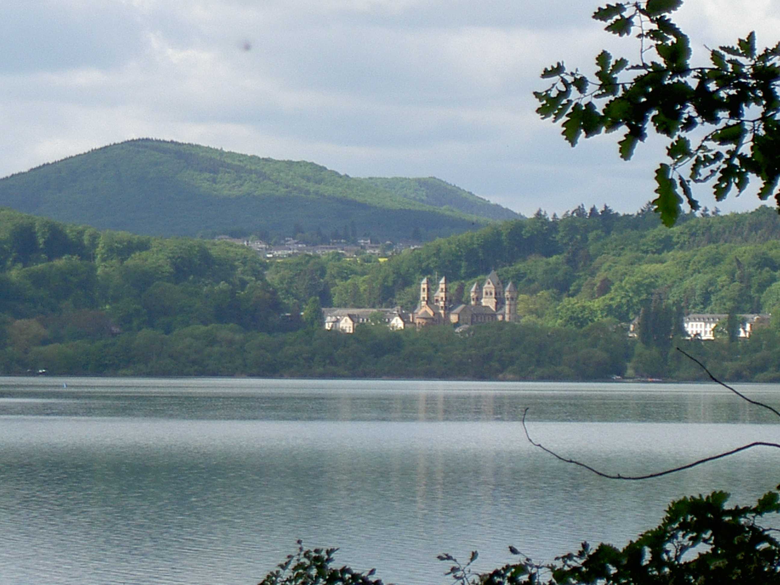 Laacher See mit Benediktinerabtei Maria Laach, Hochstein und Hochsimmer im Hintergrund
