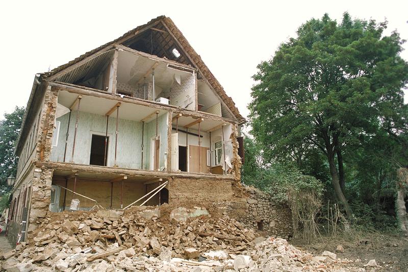 Mulde-Hochwasser August 2002: Vom Hochwasser geschädigtes Haus in Grimma. Quelle: Foto: André Künzelmann/UFZ (Nutzungsbeschränkung: kostenfrei bei redaktioneller Nutzung, Verwendung nur unter Angabe der Quelle und nur im Zusammenhang mit dem UFZ) (idw)