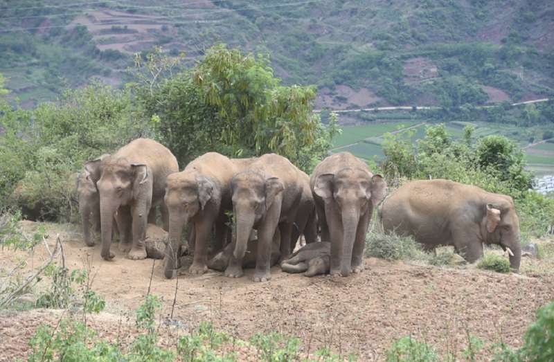 Ein am 21. Juni 2021 aufgenommenes Foto zeigt erwachsene asiatische Elefanten, die in Reihen stehen und die Kleinen zu beschatten. Bild: Xinhua Silk Road Information Service Fotograf: Cui Yonghong