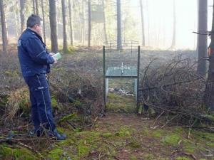 Polizist an einer nicht ordnungemäßen Falle für Füchse im Kreis Siegen-Wittgenstein. Bild: Komitee gegen den Vogelmord