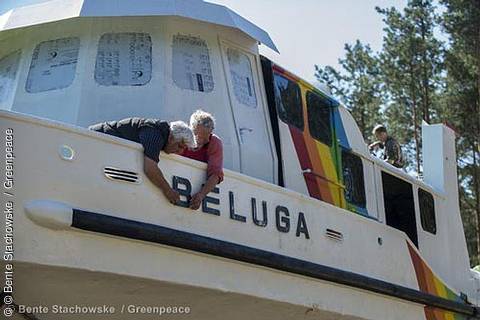 Greenpeace-Aktivisten befestigen den Namenszug am Schiffsrumpf der "Beluga". Bild: Greenpeace