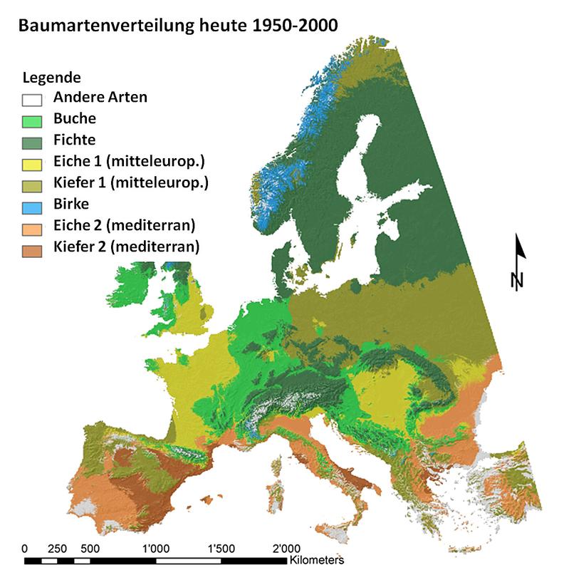 Abb. 1: Potenzielle Verbreitung der wichtigsten Baumarten in Europa für die climate normal period (1950–2000) Quelle: M. Hanewinkel / WSL (idw)