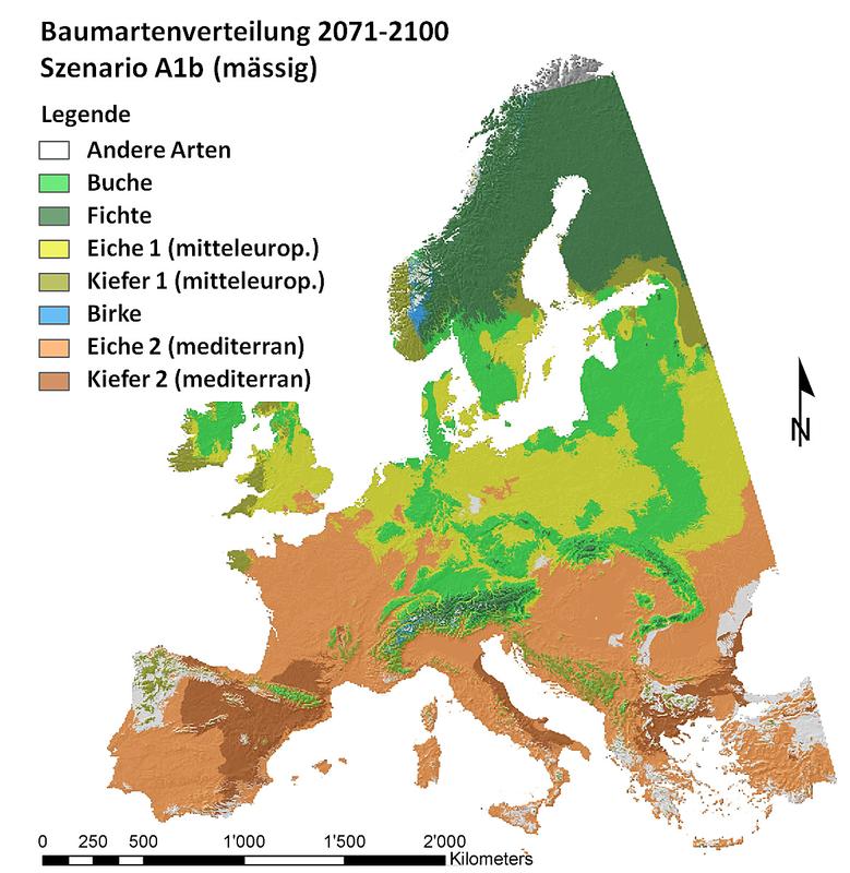 Abb. 1: Potenzielle Verbreitung der wichtigsten Baumarten in Europa für das Szenario A1B (mässige Erwärmung 2070–2100). Quelle: M. Hanewinkel / WSL (idw)
