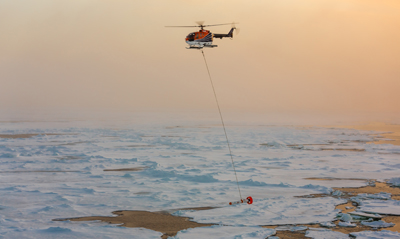Der EM-Bird zur Eisdickenbestimmung im Einsatz. Quelle: Foto: Stefan Hendricks, Alfred-Wegener-Institut (idw)