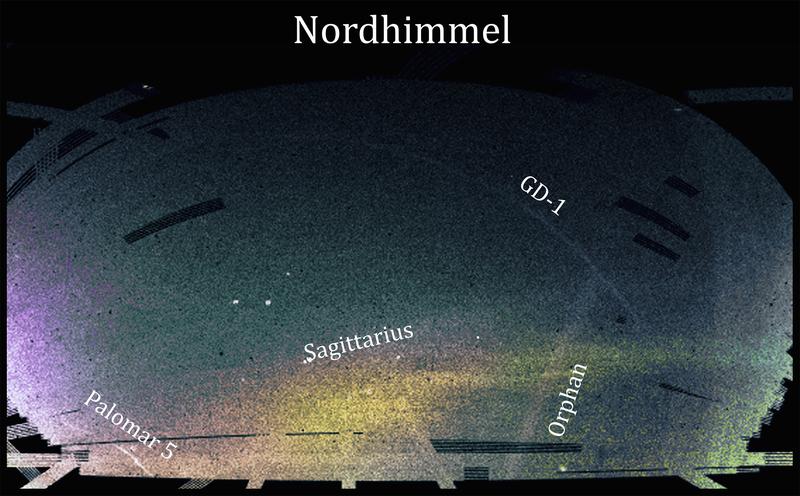 Karte des nördlichen Sternenhimmels angefertigt mit Daten des Sloan Digital Sky Surveys: Palomar 5 ist der hellste der bisher entdeckten Ströme und diente nun als Waage für die Milchstraße. Quelle: Grafik: Ana Bonaca/Yale University mit Daten des Sloan Digital Sky Survey (idw)