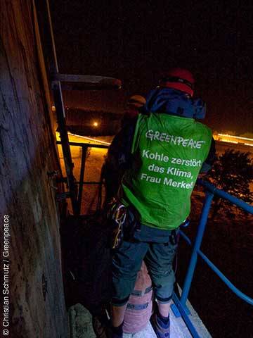 Greenpeace-Aktivisten beim Aufstieg auf den Kühlturm des Braunkohlekraftwerks Jänschwalde. Mit Kohle ist Klimaschutz nicht zu verwirklichen. Bild: Christian Schmutz / Greenpeace