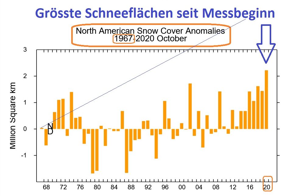 ekordschneeflächen im Oktober 2020 in Nordamerika: Noch nie seit Beginn der Aufzeichnungen 1967 gab es es mit 10,26 Millionen km² mehr als 2 Millionen km² über dem seit 2015 weltweit verbindlichen WMO-Klima-Mittel 1981-2010.