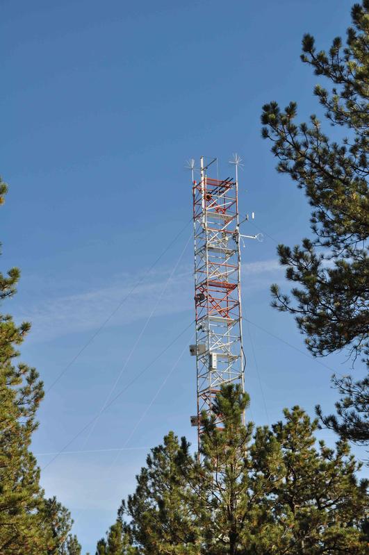 Am Fuße dieses 26 Meter hohen Messturms befindet sich die „elektronische Spürnase“: ein Protonen-Tausch-Reaktions-Time-of-Flight-Spektrometer (PTR-ToF-MS). Quelle: Thomas Karl (idw)