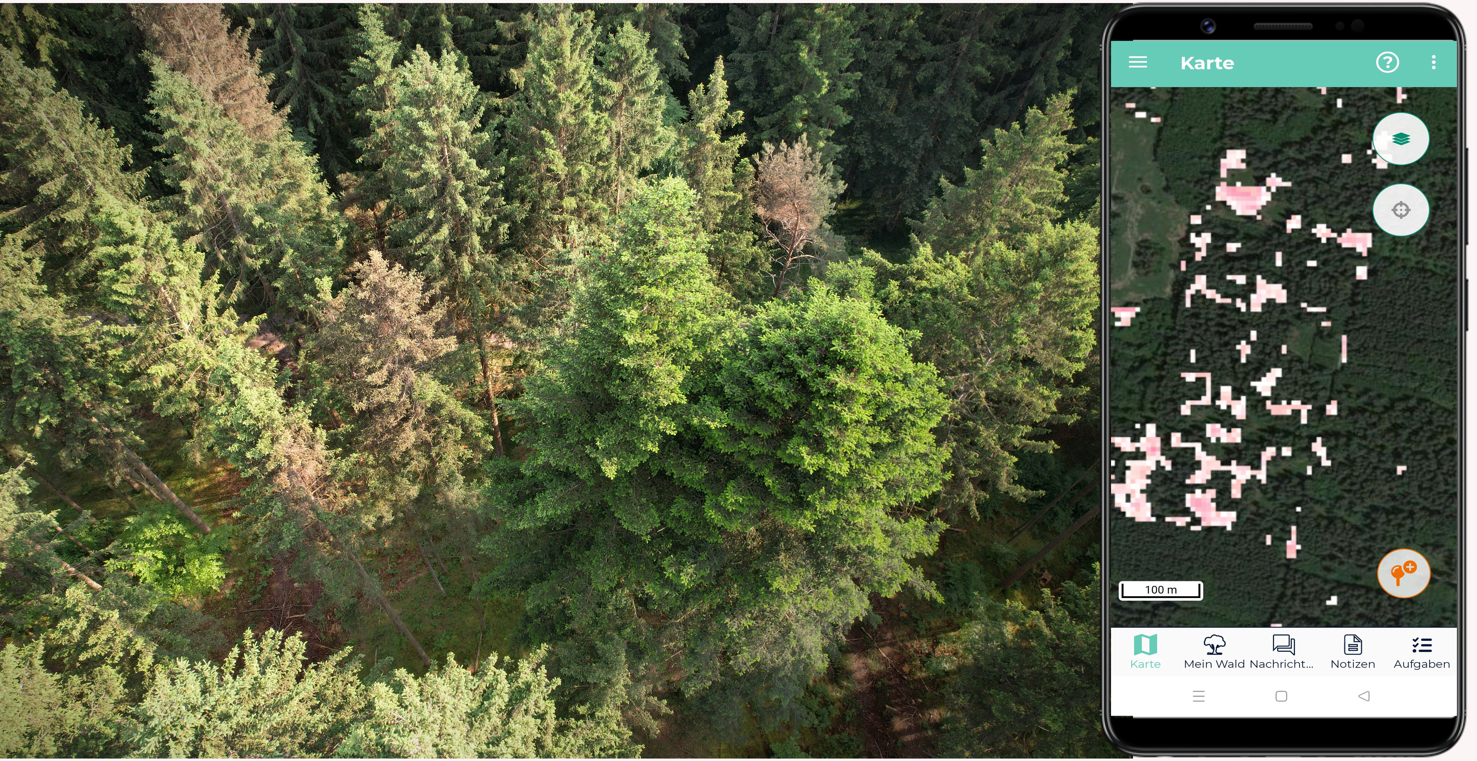 Sind diese Bäume gesund? Der Blick von oben macht klar: die Bäume leiden unter Trockenstress. Die Satelliten vernehmen die Hilferufe des Waldes! Das Trockenstress-Risiko wird in Form von rosa- bis pinkfarbenen Signalen sichtbar gemacht. Je dunkler die Farbgebung, desto höher das Risiko.