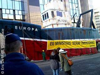 Greenpeace-Aktivisten wracken in Brüssel eine Schiffsattrappe ab. Sie fordern die Reduzierung der Fischereiflotte. / Bild: greenpeace.de