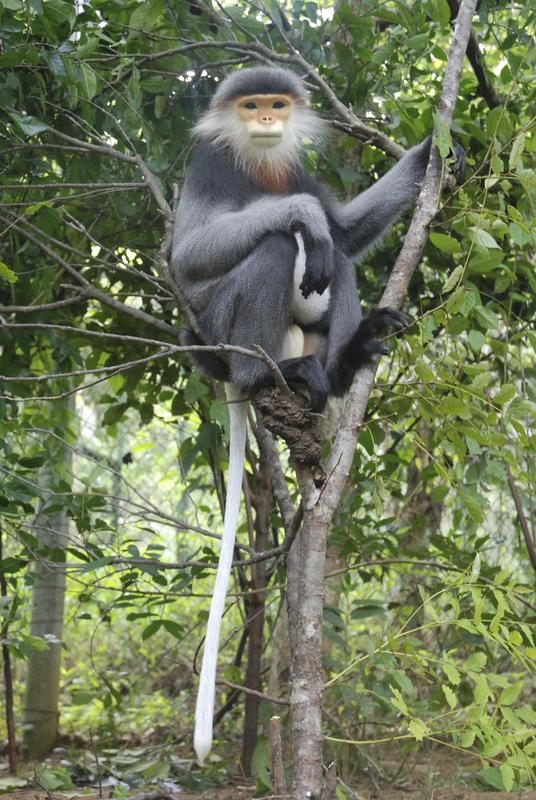 Der in Vietnam beheimatete Grauschenkel-Kleideraffe (Pygathrix cinerea) gehört zu den 25 am stärksten bedrohten Primaten der Welt 2012. Quelle: Foto: Tilo Nadler / Deutsches Primtenzentrum GmbH (idw)