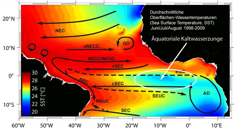 Die Meeresoberflächentemperatur gehört zu den entscheidenden Faktoren für die Niederschlagsschwankungen über Westafrika. Bildet sich beispielsweise die sogenannte äquatoriale Kaltwasserzunge im Golf von Guinea in den Sommermonaten besonders früh aus, kann Westafrika auch schon früh im Jahr mit Niederschlägen rechnen. Ist sie insgesamt eher warm, lassen die Niederschläge über Land lange auf sich warten, sind dann aber stärker. Grafik: IFM-GEOMAR; nach Brandt et al. 2011.