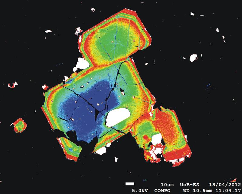 Falschfarbenbild sogenannter Orthopyroxen-Kristalle aus dem Magma, die die Forscher in der forensischen Analyse des Mount St. Helens-Ausbruchs 1980 verwendeten. Unterschiedliche Farben reflektieren unterschiedliche chemische Zusammensetzungen. Gelb stellt etwa eine besonders eisenreiche Zone dar. Quelle: Dr. Kate Saunders, University of Bristol. Bitte beachten: Das Bild ist zur Einzelverwendung im Zusammenhang mit dieser Presseinformation bestimmt und darf nicht archiviert werden. (idw)