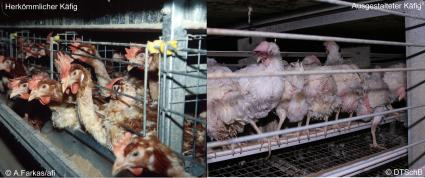 Der so genannte ausgestaltete Käfig, auch Kleinvoliere oder Kleingruppenhaltung, (rechts im Bild) genannt, bringt keinen Fortschritt im Vergleich zu der herkömmlichen Haltung (links im Bild)
