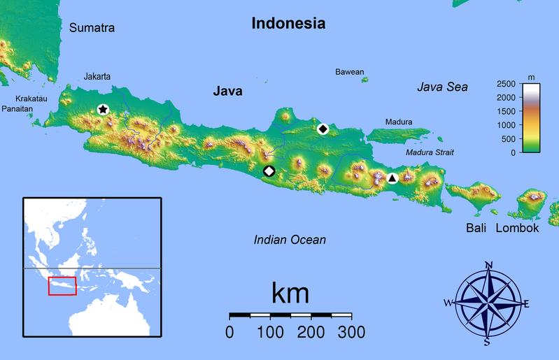 Eine Insel der Artenvielfalt: Das schwarze Dreieck im weißen Kreis markiert den Fundort der neuen Gecko-Art im Osten Javas. Quelle: Karte: Sadalmelik (Commons, CC-BY-SA-3.0) und Sven Mecke, Philipps-Universität Marburg (idw)