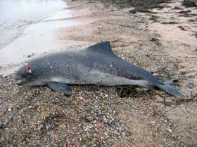 Dieser männliche Schweinswal ist in eine Schiffsschraube gekommen, die ihn typischerweise über dem Blasloch getroffen und das Nasensacksystem vollständig zerstört hat. Todeszeitpunkt: 23.-24.12.2008. Bild: R. Hahn / GSM