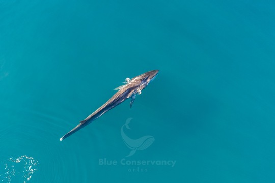 Der Finnwale ohne Schwanzfluken, sichtbare Konsequenz aus zwei Gefahren für Wale: Kollisionen mit Schiffen und Verfangen in Fischereileinen.