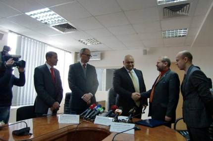 Zum Abschluss der erfolgreichen Verhandlungen reicht Umweltminister Zlochevskiy (3.v.r.) Helmut Dungler von VIER PFOTEN die Hand. Bild: VIER PFOTEN