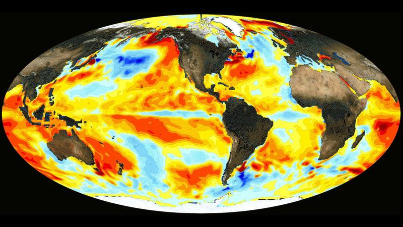 El Niño-Effekt auf die weltweite Wassertemperatur: Im Dezember 2015 waren die Temperaturen im östlichen und zentralen Pazifik deutlich erhöht. Quelle: NASA (idw)