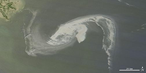 Satellitenbild des Mississippideltas vom 1. Mai 2010. Der Ölteppich ist in der Bildmitte erkennbar. Bild: NASA