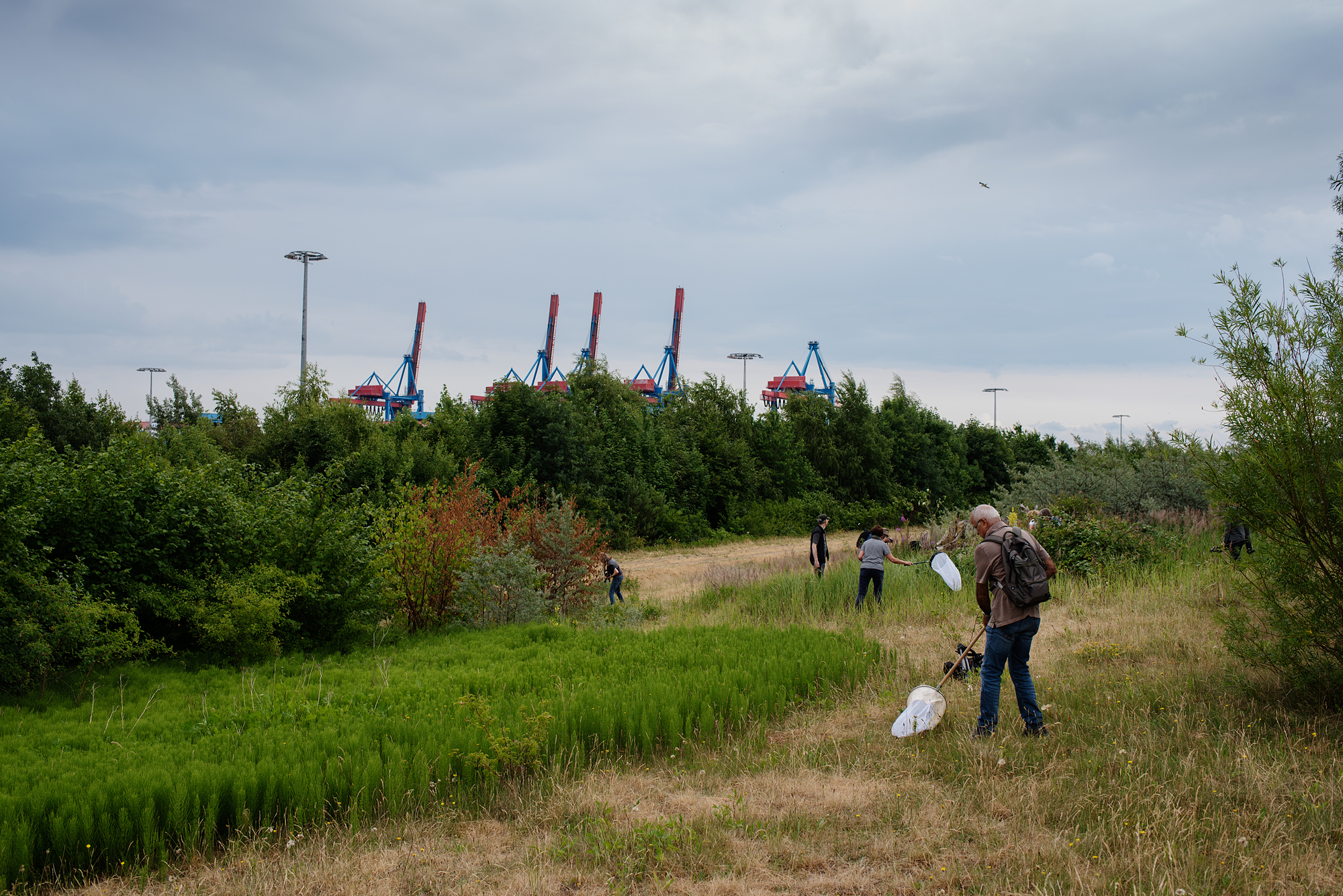 GEO Tag der Natur, 16./17. Juni in Hamburg. Moorberg Halde, die Exkursion auf den Moorberg zeigt Teilnehmern die einheimischen und eingewanderten Pflanzen und Insekten. Im Hintergrund Containerterminal Altenwerder. Bild: "obs/Gruner+Jahr, GEO/Berthold Steinhilber/laif"
