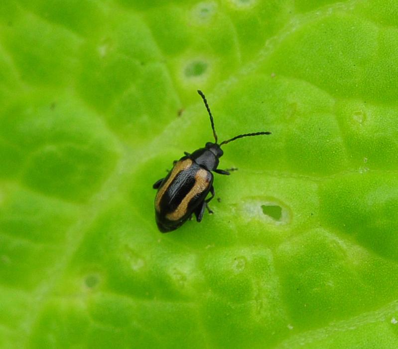 Ein Kohlerdfloh (Phyllotreta striolata) frisst an Blättern eines Chinakohls (Brassica rapa). Der Sch Quelle: Christian Ulrichs / Humboldt-Universität zu Berlin (idw)