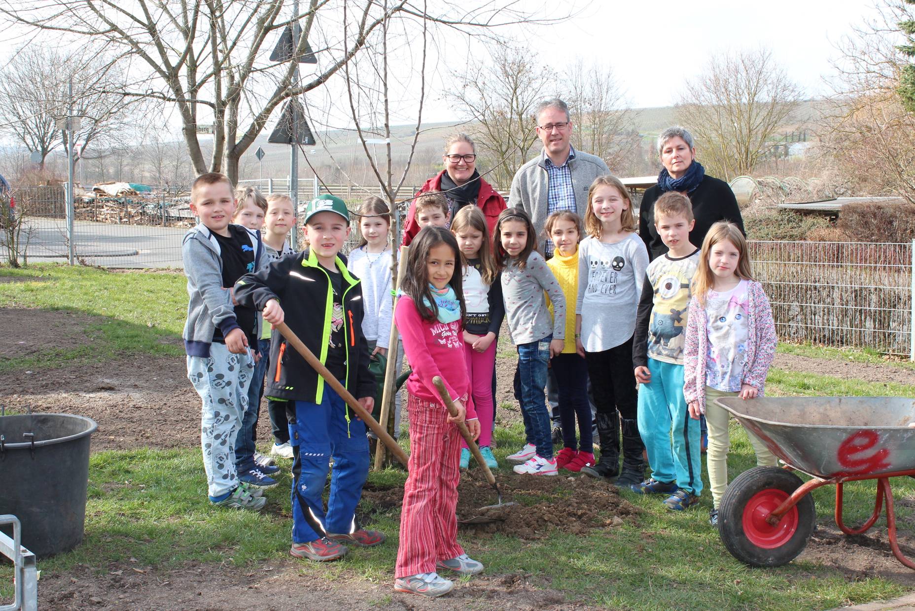 Ausgestattet mit Schaufel und Schubkarre hat die Schulgarten AG ihre eigenen Bäume im Schulgarten eingepflanzt. Gunter Jenne, Geschäftsführer von NaturEnergiePlus war mit dabei und hat den Kindern alle Fragen rund um das Thema Umwelt beantwortet. Bild: "obs/NaturEnergie+ Deutschland GmbH/NaturEnergiePlus"