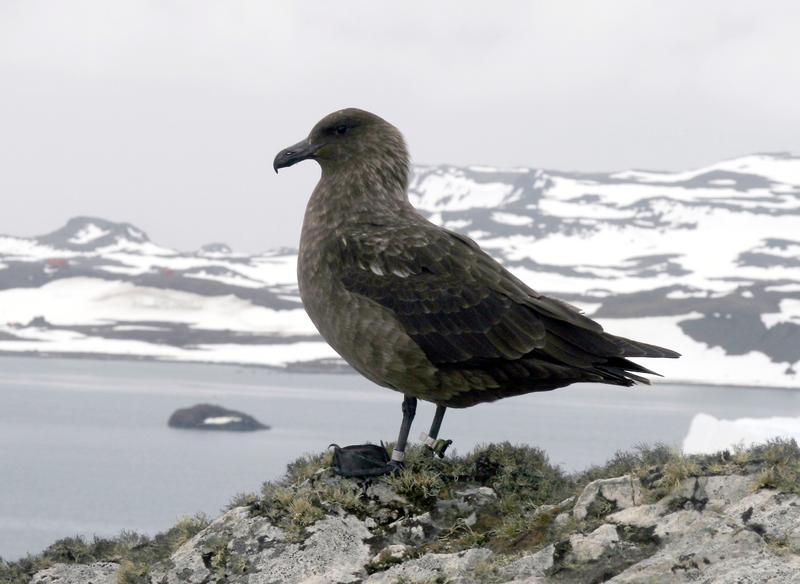 Südpolar-Skua mit GLS-Logger am rechten Bein.Bild: Matthias Kopp/FSU (idw)