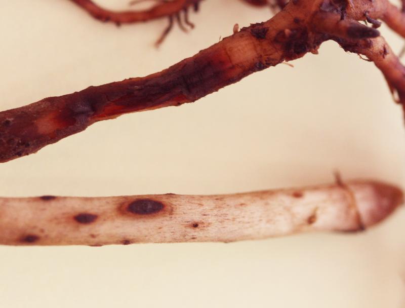 Wurzel der resistenten Banane Yangambi km5 (unten) mit wenigen, Phenylphenalenone beherbergenden Ber Quelle: D. Hölscher / Max-Planck-Institut für chemische Ökologie (idw)