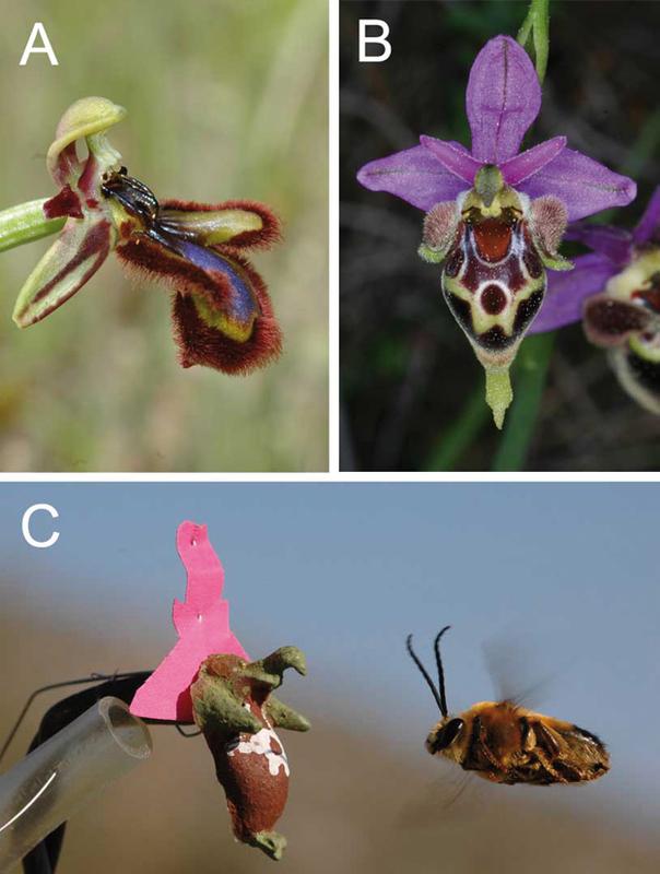 Zwei echte Blüten der "Spiegelragwurz" (A), "Heldreichs Ragwurz" (B) sowie ein künstlicher "Orchideen-Dummy" (C). Aus dem Plastikschlauch kommt das Originalparfum.