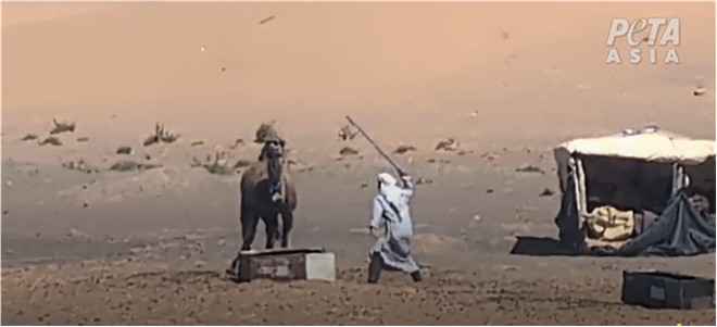 Screenshot: Ein Mann schlägt gewaltsam mit einem Stock auf ein Kamel ein. Bild: PETA Asien Fotograf: PETA Deutschland e.V.