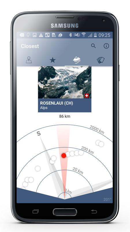 Ein Kompass zeigt von der aktuellen Position des Benutzers auf die nächstgelegenen dokumentierten Gletscher. Quelle: World Glacier Monitoring Service (idw)