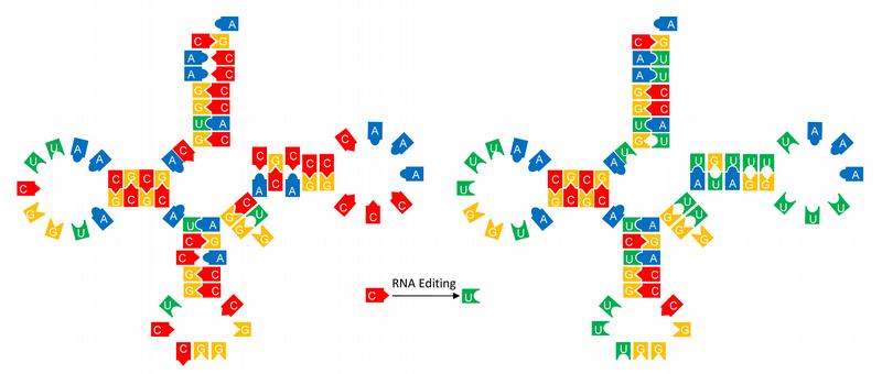Ein kleines Schlüsselmolekül - eine so genannte tRNA für die Aminosäure Prolin - zeigt, wie umfangreich das RNA editing in Isoetes sein kann: An 18 Stellen werden C-Bausteine gegen U-Bausteine getauscht. Nur die Us können dann an vielen wichtigen Stellen mit den As gegenüber paaren. Bild: AG Knoop, Uni Bonn