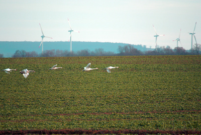Windräder gegen Kraniche. Bild: Karl-Heinz Laube / pixelio.de