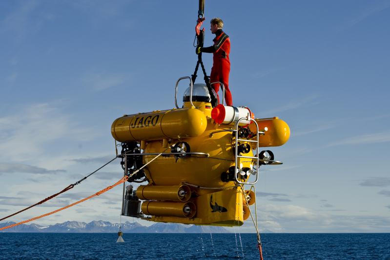 Das Tauchboot JAGO während der Expedition MSM21/4. Im Hintergrund ist Spitzbergen zu sehen. Quelle: Foto: Felix Gross, GEOMAR (idw)