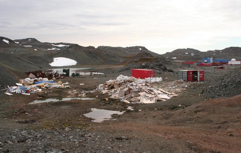 Die Müll-Realität in der Antarktis: Eine chinesische Mülllagerfläche in der Saison 2008/09 auf der Fildes-Halbinsel auf King George Island. Im Hintergrund die Station Great Wall. Quelle: Foto: Anja Nordt/FSU (idw)