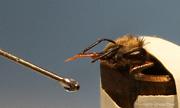 Honigbiene, die den Rüssel ausstreckt, um einen Tropfen Zuckerlösung von einer Pipette aufzusaugen. Foto: Martin Strube-Bloss