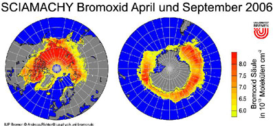 Abb. 1: Verteilung des bodennahen Bromoxids im polaren Frühjahr 2006 (links: April 2006, rechts: September 2006). Die Verteilung wurde aus Messungen des Satelliteninstruments SCIAMACHY berechnet und zeigt stark erhöhte Bromoxid-Konzentrationen über Meereis und in Küstennähe.