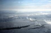 Abb. 2: Meereis in der Framstraße nördlich von Spitzbergen. Meereis wirkt als Isolator zwischen dem relativ warmen Ozean und der kalten Atmosphäre. Der Stoff- und Wärmeaustausch an Stellen von eisfreien Rinnen ist auf dem Foto zu sehen: Seerauch dampft aus den Rinnen im Meereis. Foto aus etwa 500 m Höhe, 1998. © Lars Kaleschke