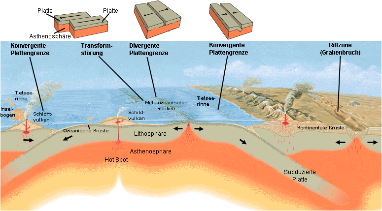 Schematische Darstellung der Prozesse entlang der Plattengrenzen und wesentlicher damit einhergehender geologischer Erscheinungen Bild: de.wikipedia.org