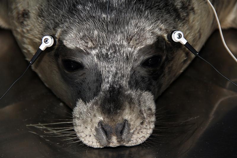 Mit speziell angepassten In-ear-Kopfhörern haben TiHo-Forscher das Hörvermögen von Kegelrobben unter Quelle: Foto: ITAW (idw)